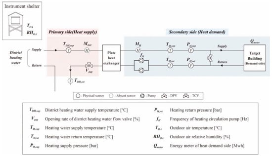 District heating systems (DHSs) are widely adopted for heating buildings, especially in urban areas of several countries worldwide. This is because DHSs can provide efficient heating, with low primary energy resource consumption and less impact on the environment []. With the advancement of sensor networks, data analysis, and data-driven applications entailing building energy systems, various management and control technologies have been recently studied with regard to district heating (DH) substations []. The monitoring of DH energy consumption in a building can provide: (1) information regarding efficiently controlling the system and (2) historical energy datasets for predictive control methods, fault detection and diagnosis (FDD), and system operation pattern analysis. Therefore, continuous monitoring of building energy consumption is essential for optimal DHS control and operation, and for advanced application development.