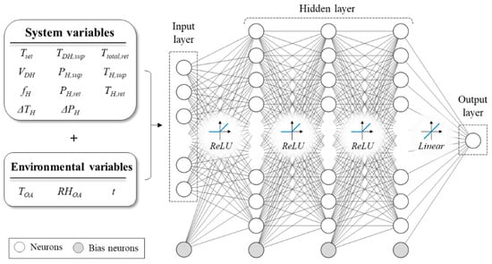 The data-driven virtual sensor (Case 2) was modeled, as in Equation (3), by incorporating the relevant variables using a multilayer perceptron (MLP) neural network []. As shown in Figure 3, the relevant variables were divided into two categories, namely system variables (xsys) and environmental variables (xenv). System variables were internal information of the system, including pressures, temperatures, and control signals. Additionally, the calculated pressure difference (ΔPH) and temperature difference (ΔTH) at the secondary supply and return side were defined as the MLP input variables. The environmental variables, that is, the outdoor air temperature (TOA), relative humidity (RHOA), and operation hours (t), were also defined as the MLP input variables. The metered heating energy consumption was used as the MLP output.