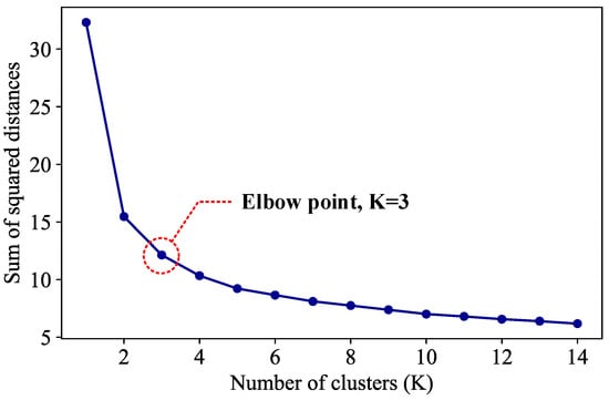 Clustering is the process of partitioning a dataset into subgroups based on similarity. The similarity between clusters is normally determined by distance. K-means is a centroid-based clustering algorithm that has been widely used in identifying system operation patterns in buildings [,]. In this study, k-means clustering was used to define the operation patterns of the DHS. The cost function is defined in Equation (8). The input variables of the k-means clustering included the hourly heating energy consumption over a day to identify the daily operation patterns. The clustering period was from December to March. The value of K, the number of clusters, was defined as K = 3 based on the elbow method [], as shown in Figure 4. The k-means process was conducted using Python libraries.