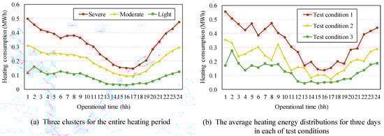 Figure 5a shows the clustering results for the entire heating period (December to March). Three operation patterns were determined based on the daily heating energy consumption levels (severe, moderate, and light heating levels). According to the three clusters, to evaluate the virtual sensor performance, the three operation patterns were defined as follows: (1) Test condition 1: severe level, (2) Test condition 2: moderate level, and (3) Test condition 3: light level. For each testing condition, three different days were selected from the testing datasets. Figure 5b shows the average heating energy consumptions for the three days selected for each test condition.