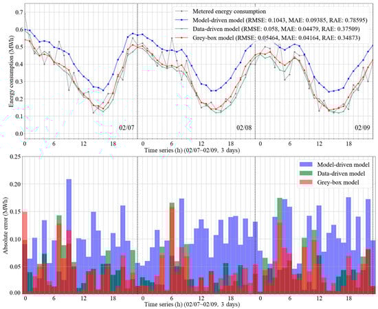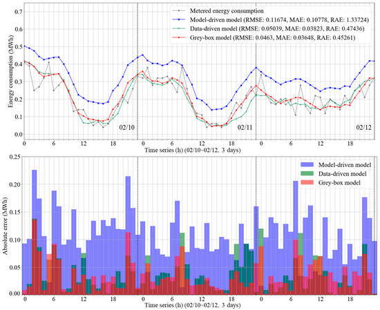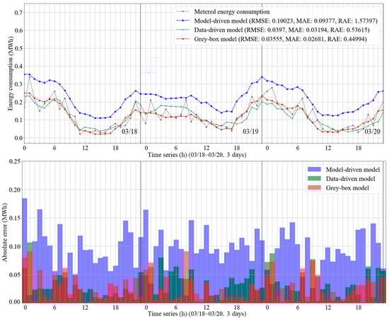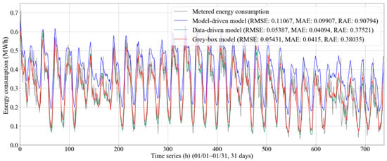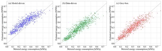 Figure 9 shows the time-series plots of the estimated heating energy consumption obtained by the virtual sensors. As mentioned for the training results, the model-driven virtual sensor showed a substantial difference between the estimated and metered trends (RMSE = 0.10). Comparing the data-driven and grey-box virtual sensors, the grey-box virtual sensor performed slightly better than the data-driven virtual sensor in terms of the three evaluation indices. This demonstrates that the data-driven and grey-box virtual sensors can considerably adapt to the operation patterns exhibited by the training datasets. Nevertheless, all virtual sensors did not capture the dramatic increase and decrease in heating energy consumption in the building. This was because of the data acquisition frequency difference between the system sensors and meters.