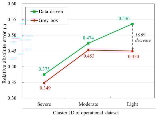 The data-driven and grey-box virtual sensors were compared with regard to the remaining test conditions; the comparison was based on the relative absolute error (RAE) index. The days corresponding to moderate and light clusters in the test dataset were included. Regarding the moderate cluster, as shown in Figure 10, the two virtual sensors exhibited slightly lower accuracies compared to those in the first test condition. This was because of the lower ratio of datapoints corresponding to the moderate cluster in the total training datasets.