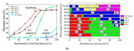 In combination with Figure 7b,c, it was found that during the injection of 60% of total sand, approximately 48.5% of injected sand settled in slot 2 because of fluid partition, resulting in a large placement area of 77.7%. Importantly, there is a strange phenomenon that more proppants entered the 150°-branch than the 30°-branch, with the placement area in the 150°-branch reaching 72.2%. According to Tong and Mohanty [15], the sand amount entering the branch with a large angle was less than that entering the branch with a small angle. For the result in this paper, it was deduced that due to a short transporting distance in the 30°-branch, some proppants entering this branch were carried by the fluid out of the fracture system before they settled on the bottom. This behavior caused errors in recording the placement area in the 30°-branch. Using a low pumping rate may mitigate this error.