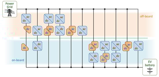 EV battery chargers (EVBC) are classified into two main groups in relation to their position to the EV, namely on-board or off-board, i.e., inside or outside the EV. By comparing both approaches, it is possible to identify advantages and disadvantages of each charging architecture. For instance, an on-board EVBC offers more flexibility in terms of the possibility of charging the battery at different places, but currently has its charging power limited to a few kW, besides representing an additional weight to the EV. On the other hand, an off-board EVBC is installed in a specific place (public or private) and the EV must travel there to perform the battery charging, but the charging power can be higher, up to dozens or hundreds of kW. Both on-board and off-board EVBCs are constituted by power electronics stages in order to guarantee a proper interface between the power grid and the EV battery. Therefore, and considering the wide variety of power electronics converters, several perspectives can be adopted. The most common structures are based on alternating current–direct current (ac-dc) converters guaranteeing a sinusoidal grid current (i.e., preserving power quality on the power grid side) and a dc–dc converter guaranteeing controlled current and voltage on the EV battery (i.e., preserving the battery lifetime), in both on-board and off-board cases [,,]. However, other structures can be adopted, including the possibility of single power stage structures. A classification of the different structures, based on single or double power stages, is presented in Figure 1. As emphasized, this classification considers the on-board and off-board possibilities. As an illustrative example, Figure 2 shows an EV considering both on-board and off-board EVBCs and the respective interface with the power grid. As shown, the on-board EVBC is connected to the power grid through a single-phase interface with the possibility of a bidirectional power flow, while the off-board EVBC is connected to the power grid through a three-phase interface, also considering the possibility of a bidirectional power flow, allowing both G2V and V2G operation modes. This is an increasingly more important feature for smart grids and smart homes, although it normally implies in a more complex implementation of the power stages.