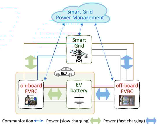 EV considering both on-board and off-board battery chargers and the respective interface with the electrical power grid, allowing bidirectional power flow and communication.