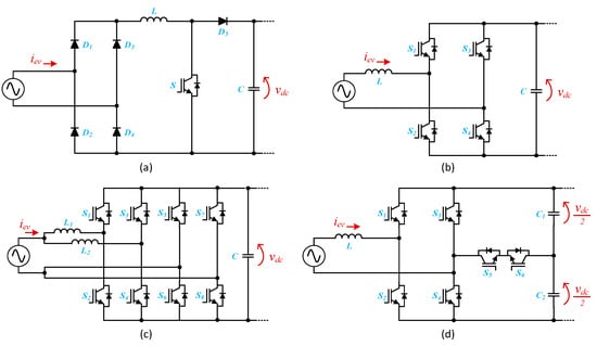 Main single-phase power electronics converters used as front-end power stage of on-board electric vehicle battery-charging system (EVBC): (a) unidirectional power factor correction; (b) bidirectional full-bridge; (c) bidirectional interleaved full-bridge; (d) bidirectional multilevel.