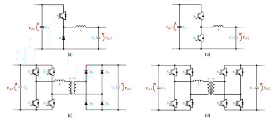Main power electronics converters used as back-end power stage of on-board EVBC: (a) unidirectional buck-type; (b) bidirectional half-bridge; (c) unidirectional isolated; (d) bidirectional isolated (dual active bridge).