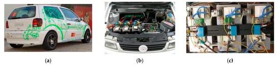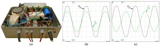 Figure 5a presents an example of a developed on-board EVBC. In this system, the topology shown in Figure 3d was used as the front-end converter and the topology shown in Figure 4b was used as the back-end converter. This figure also shows some results obtained during the experimental validation of this on-board EVBC []. These results are merely illustrative of the operation principle, having been obtained for the front-end converter. The result of Figure 5b shows the current on the power grid side, allowing to verify that it has a sinusoidal waveform and it is in phase with the power grid voltage. This result is related to the G2V operation mode. The result in Figure 5c also shows the current and the voltage on the power grid side, but, in this case, during the V2G operation mode (i.e., the current and the voltage are in phase opposition).
