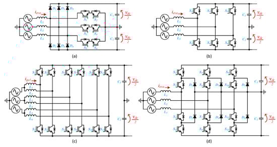 Main three-phase power electronics converters used as front-end power stage of off-board EVBC: (a) unidirectional VIENNA-type topology; (b) bidirectional full-bridge; (c) bidirectional interleaved full-bridge; (d) bidirectional multilevel.