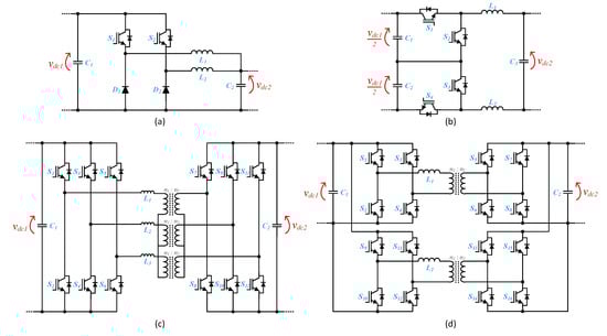 Main power electronics converters used as back-end power stage of off-board EVBC: (a) unidirectional interleaved buck-type; (b) bidirectional multilevel; (c) bidirectional three-phase isolated; (d) bidirectional multiple dual active bridge.