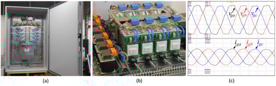 Off-board EVBC: (a) example of a developed laboratory prototype; (b) detail of the power electronics converters; (c) experimental results showing the voltages (vga, vgb, vgc: 100 V/div|5 ms/div) and the currents (iga, igb, igc: 10 A/div|5 ms/div) on the power grid side.