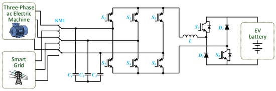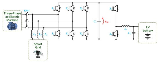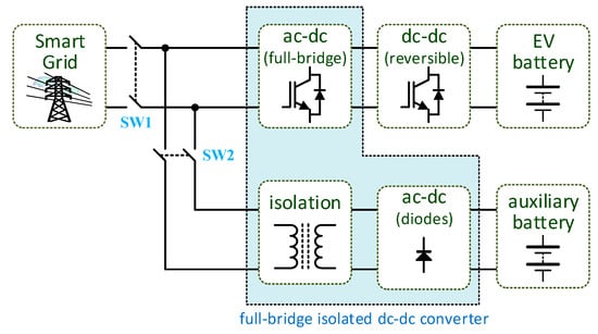 Besides the aforementioned EVBC, the EV must also be equipped with a charging system for the auxiliary battery. In the same way as a conventional vehicle, the internal electronic loads of an EV must be powered by an auxiliary battery (i.e., a low power battery). In such electronic loads are included systems that guarantee driving safety (e.g., lights, windshield wipers, and horn), comfort (e.g., air conditioning and media systems), and driving support (e.g., sensors and global positioning system) []. Conventionally, in an internal combustion engine (ICE) vehicle, the auxiliary battery is charged via an electric generator, named as alternator, which is coupled to the ICE. In contrast, in electric and hybrid vehicles, this charging operation takes place through a dc–dc converter which is connected, on the higher voltage side, to the traction battery. For this task, isolated dc–dc converters must be used because, according to the IEC 61851-1 standard, it is mandatory that the traction batteries are isolated from the vehicle chassis. In [] is presented a power electronics solution based on an integrated converter to enable the energy exchange between two batteries with different voltage levels. A three-port converter topology based on the triple active bridge converter is addressed in [], a system that allows auxiliary battery charging from the traction battery with galvanic isolation ensured by a three winding high-frequency transformer. In [], a method for controlling the auxiliary battery charging via the traction battery is patented, where the auxiliary battery charging is carried out, whenever possible, during the standby of the EV, and according to the state of charge of both auxiliary and traction batteries. In [], an integrated solution based on power electronics is presented for charging the auxiliary battery from the traction battery, identified as traction-to-auxiliary mode. In the presented on-board solution, shown in Figure 9, a unified converter topology, the EVBC can be configured in an isolated full-bridge dc–dc converter the auxiliary battery charging, thus making the traction-to-auxiliary mode possible. In [], a topology based on the combination of a boost-type dc–dc converter and a flyback converter is presented for auxiliary battery charging, where the primary side of the transformer of the flyback converter is used as the input inductor of a boost-type dc–dc converter where the EV battery is connected to. In [], it is presented a strategy without auxiliary battery, where the loads are supplied by the EV battery. An intermediate 48 V dc link was considered and implemented by means of a buck-type dc–dc converter, to which the EV battery is connected on the higher voltage side. In this situation, a transformer is used to ensure galvanic isolation. In the created 48 V dc link, several dc–dc converters are placed, also based on the buck-type dc–dc converter, which result in voltages of 12 V to supply the various auxiliary loads. The availability of a 48 V dc link is considered to be more efficient when compared to the traditional 12 V dc link, since, for the same power, a higher voltage allows the use of electrical cables of smaller section that are, consequently, lighter [].