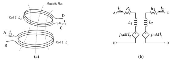 In both “cored” or “wireless” versions, when submitted to sinusoidal oscillations of sufficiently low frequencies (negligible irradiated power), the magnetic coupling voltages and currents can be modeled in terms of phasors by ideal linear circuit components, as shown in Figure 10.
