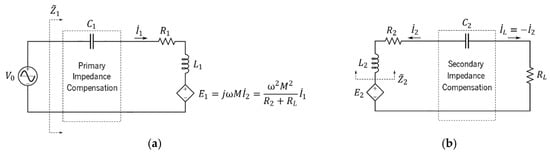 In order to increase , and have to be increased while keeping the phase delay of with respect to as close as possible to . This is achieved by introducing compensation networks in primary and secondary circuits. The simplest and first engineered compensation network is constituted by a single capacitor in series with the load, as shown in Figure 11b, a configuration already used by Nikola Tesla in the late 19th century [], which is called “series compensation”. In this configuration, the reactive component of the equivalent impedance , as seen by , is canceled at when .