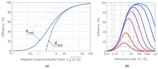 Efficiency in a serial-serial (SS)-compensated inductive wireless power transfer (IWPT): (a) maximum achievable efficiency with optimal load, as a function of; (b) efficiency as a function of the normalized load.