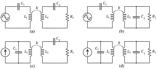 This behavior and its simplified formulation, as given by (7) and (8), have been characterized by many other authors since Terman [], and also need to be considered in IWPT design, either to avoid the frequency splitting operation [,] or to exploit it, and tune circuits to the most adequate operating frequency []. Frequency splitting, however, is not unique to SS-compensated circuits. This phenomenon can occur, and be exploited, in other circuit topologies, due to the presence of multiple poles in the circuit transfer function and the joint dependence of their location on the coupling coefficient and the load. For all basic IWPT configurations, as displayed in Figure 13, it has been shown that frequency splitting is prone to be observed whenever the loaded quality factor of the primary is lower than the loaded quality factor of the secondary [].