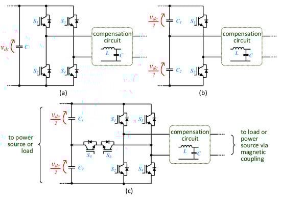 Main power electronics topologies used in IWPT, both in primary side and secondary side: (a) full-bridge converter; (b) half-bridge converter; (c) multilevel topology.