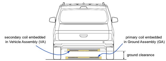 As defined in SAE J2954, the secondary coil is included in a structure denominated “Vehicle Assembly” (VA), and the primary coil in the “Ground Assembly” (GA), as marked in Figure 15. Without determining specific electronic implementation, the SAE J2954 establishes power transfer classes, and fixes minimum performance parameters regarding the geometry and alignment tolerances between primary and secondary coils. It also provides examples of viable circuit implementations. Table 1 and Table 2 provide a summary of SAE proposed classes of IWPT power and clearance distances from VA to ground.