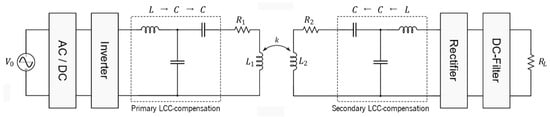 Although not enforcing any particular circuit implementation, SAE 2954J suggests some viable circuit topologies. In particular, it exemplifies and provides actual circuit parameters for PP-compensation and for the so-called LCC-compensation [], that can be used either on primary or secondary sides, or on both [], as shown in Figure 16. The LCC term comes from “inductor-capacitor-capacitor”, which is exactly the sequential order of the passive components that are introduced in between the power source (or the load) and the magnetic coupling. LCC exemplary circuits are provided in SAE 2954J with specific component values assigned, to facilitate an implementation where the required performance levels are assured to be met.