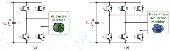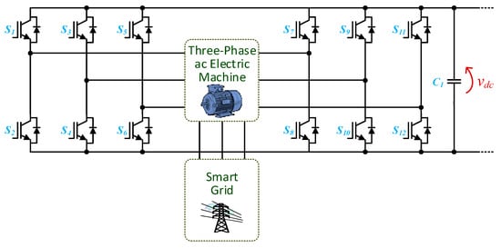 Regarding on-board EVBCs, more specifically, for power electronics converters for the front-end stage, when focusing on unidirectional converters, the main topology is based on the diode ac-dc converter followed by the boost-type dc–dc converter (i.e., the unidirectional power factor correction). This topology has the main advantage of using only one switching device, still guaranteeing the operation with sinusoidal current and unitary power factor. This topology is shown in Figure 3a. On the other hand, in a future perspective of electric mobility as a support for the smart grid, a bidirectional operation is essential, in which the four-quadrant ac-dc converter is used as the main topology (i.e., a bidirectional full-bridge). This converter, shown in Figure 3b, allows bidirectional operation (G2V and V2G modes) without neglecting the sinusoidal current and the unitary power factor. These two topologies are more commonly used. However, when the main objective is to reduce the need for passive filters coupled to the power grid and the maximum current in each semiconductor, to maintain the characteristic of bidirectional operation, the main choice lies in interleaved type topologies. Figure 3c shows the most common bidirectional interleaved full-bridge ac-dc topology, consisting of two four-quadrant ac-dc converters (i.e., dual-phase interleaved topology). When the main objective is to reduce the maximum voltage applied to each semiconductor, as well as to reduce the requirements of passive filters coupled to the power grid, the main choice lies in multilevel topologies. Figure 3d shows one of the most common multilevel bidirectional ac-dc topology (i.e., a topology of five voltage levels).