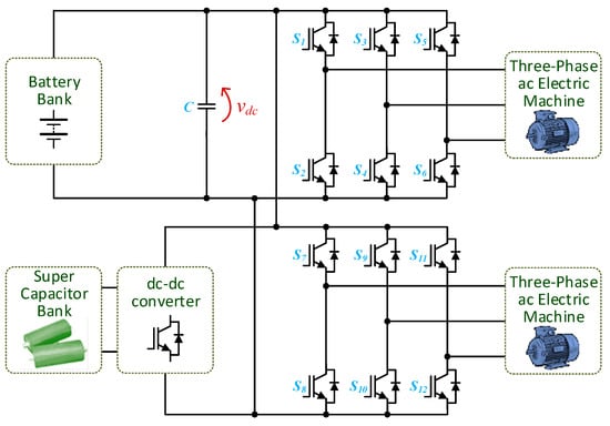 - Herath, N.; Binduhewa, P.; Samaranayake, L.; Ekanayake, J.; Longo, S. Design of a dual energy storage power converter for a small electric vehicle. In Proceedings of the IEEE International Conference on Industrial and Information Systems (ICIIS), Peradeniya, Sri Lanka, 15–16 December 2017; pp. 1–6. [Google Scholar]