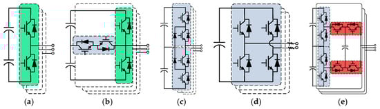 Demonstration of the candidate topologies: (a) two-level voltage-source converter (2L-VSC); (b) three-level T-type converter (3L-T2C); (c) three-level neutral-point clamped converter (3L-NPC); (d) two-level H-bridge voltage-source converter (2L-HB); and (e) five-level hybrid active neutral-point-clamped converter (5L-HANPC). Green: 1700 V IGBT; blue: 1200 V IGBT; red: 650 V IGBT.