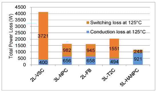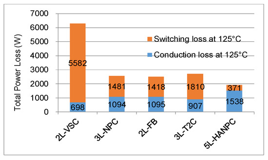 where the switching energy loss coefficient Ek represents Eon + Eoff for the IGBT or Erec for the diode, Itest and Utest are the rated test conditions noted on the datasheet, and Ssw(θ) indicates whether the IGBT or diode has the switching loss or not at a certain phase angle θ in one AC cycle. All topologies were evaluated in both the rated rectifier mode and inverter mode. The results in the inverter mode with the rated conditions are given in Figure 2. According to the results, the 2L-VSC showed a much higher total loss than the other multilevel topologies, because that the 1700 V IGBT module had a poor switching loss performance, which was identified by analyzing the datasheet of devices and the loss distribution. On the other hand, half of IGBT modules in the 3L-T2C were 1700 V-type, and thus the total loss was also too high. Among all the topologies, 5L-HANPC had the lowest switching loss and the lowest total loss. The extremely low switching loss is not only because that the voltage step decreased to 1/4 of the DC link voltage, but also because the 650 V IGBT modules in the 5L-HANPC were the only devices under high-frequency switching after applying a commonly used low-loss modulation scheme. The results in the rectifier mode under the rated conditions are given in Figure 3. It can be found that the tendency kept the same and the 5L-HANPC was the one with the best performance.
