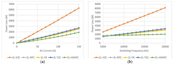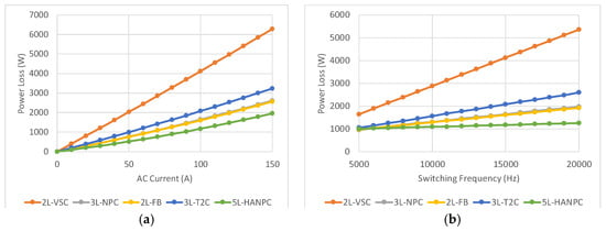 Another comparison was made by fixing the modulation index and power factor in the rated conditions while varying the switching frequency or output current. The results in the inverter mode and the rectifier mode are shown in Figure 4 and Figure 5, respectively, and showed that changing output currents did not affect the tendency since the loss was almost proportional to the output current for all topologies. However, after the switching frequency was decreased to be lower than 7 kHz, the power losses of the 3L-NPC and the 2L-FB became lower than that of the 5L-HANPC. It is because, under low switching frequencies, the conduction loss dominated the total loss and the 5L-HANPC had the highest conduction loss.