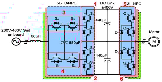 According to the loss comparison results, the 5L-HANPC was the first choice. Another advantage is that the 5L-HANPC may decrease the volume and weight of an AC inductor, which is necessary for rectifiers. However, according to the comparison in Table 3, more IGBTs were required to install, which in turn increased the surface area of the heatsink and required additional flying capacitors in the 5L-HANPC. On the other hand, by considering both the number of modules and the total loss, we found that the 3L-NPC and the 2L-FB could also be the favorable choices. However, the 2L-FB must connect to motors with three separated stator windings, and thus a specially designed motor was required. As a result, the 3L-NPC could be the best choice, especially for the inverter stage, where no AC-side inductor was required.