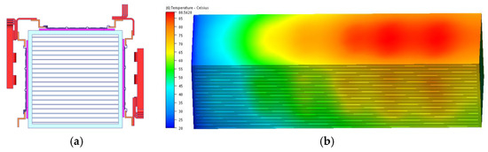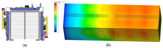 (a) Improved heatsink version II; and (b) its FEA results (maximum temperature on the heatsink surface: 78 °C).