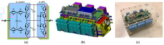 In our research, a 5L-HANPC and 3L-NPC (5L-3L) asymmetrical voltage-level multilevel back-to-back converter prototype was built to evaluate the power density of the power converter. The schematic of this prototype is demonstrated in Figure 6. The specification of the prototype, and the selection results of all main components are given in Table 4. The design of the volume of the passive components followed the criterion, which is for selecting the minimum volume while satisfying requirements of voltage ripples or current ripples.