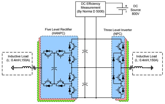 In order to test the power loss of the converter, each side of the converter was tested in the inverter mode, where the DC link voltage was connected to an 800 V DC source and the AC output was connected to a purely inductive load. The test set is given in Figure 11. The DC-side efficiency was tested by using a power analyzer Norma D 5000 (Fluke, Everett, WA, USA). By using this method, each side of the converter was powered to full-load conditions, while the DC source only provided a small amount of power, which was equal to the power losses on both converters and inductive loads. During the test, by varying the modulation indices M of both sides of the converter, the output current was changed from zero to its maximum point. Then, the total power losses were recorded. The power losses of the inductive loads were estimated with the models described in [,]. By deducting the power losses on inductive loads, the power losses on converters were finally derived.