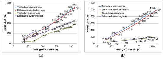 Figure 12a shows tested losses and estimated losses for the 3L-NPC under different load conditions. The results showed that the estimation of the conduction loss was quite precise within the whole-load condition. The estimation of the switching loss showed a slightly larger error than that of the conduction loss. Nevertheless, the accuracy was accepted for topology evaluation. Figure 12b shows tested losses and estimated losses for the 5L-HANPC under different load conditions. The results also showed that the estimation of the power loss was correct.