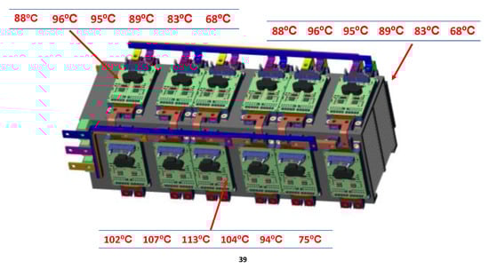 The thermal system performance was verified by investigating the temperature rise on each negative temperature coefficient (NTC) sensor embedded in IGBT modules. There were totally 18 NTC resistors belonging to 18 IGBT modules. The ambient temperature Ta for testing was 20 °C, and the air flow was 120 cubic feet per minute (CFM). The converter was tested under full-load conditions: Vdc = ±400 V; Iac = 100 A. The data received from the NTC temperature sensor are plotted in Figure 13. From the results, it can be found that the distributions of the temperature were similar in all three surfaces. On the other hand, the 3L-NPC modules had the highest temperature rise. This is because the power loss per each module in the 3L-NPC was still larger than the power loss per module in the 5L-HANPC.