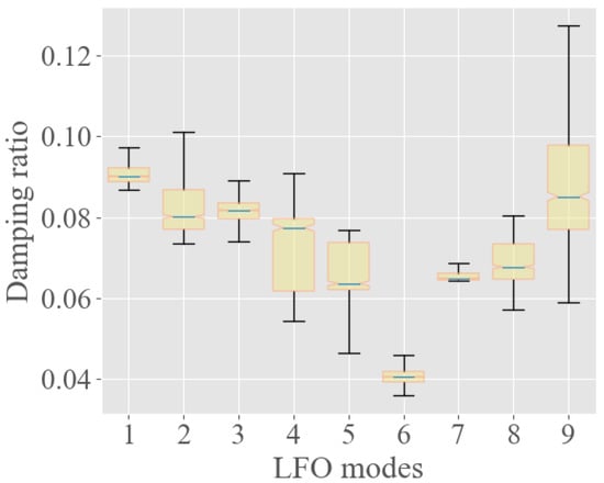 For the test system, there are 9 poorly damped low frequency oscillation (LFO) modes. The probability of these modes is shown in Table 1. A box plot of their damping ratio is shown in Figure 3.