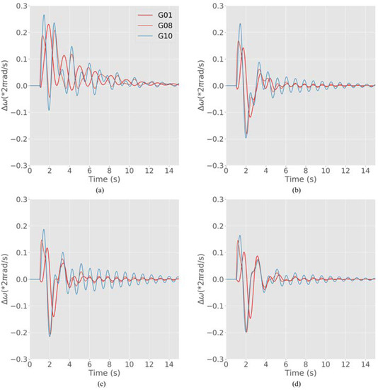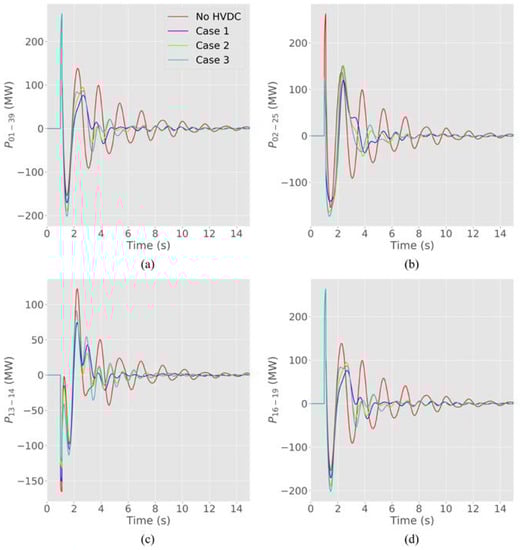 To demonstrate the damping performance of the HVDC system, a three-phase fault is caused on the transmission line 14–15 of the 39-bus system at t = 1 s and lasts for 0.1 s. The simulation results are shown in Figure 5. Case 1: one HVDC system connects to bus39; Case 2: two HVDC systems connect to bus39 and bus1; Case 3: three HVDC systems connect to bus39, bus1 and bus39.