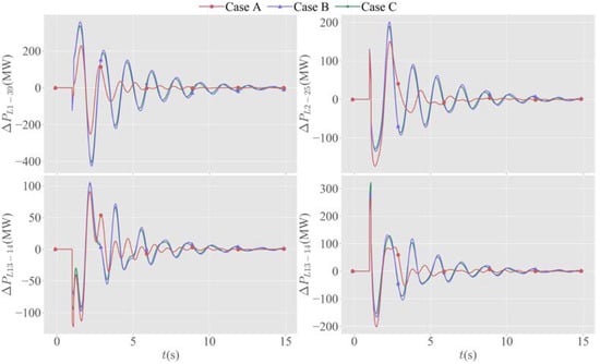 By contrast with the previous location selection method of HVDC systems, the proposed method mainly focusses on the impact of the locations on system stability. In [,], the best locations of HVDC links in 39-bus systems are identified as {bus3, bus22, bus35} and {bus8, bus20, bus27}, respectively. To compare the system dynamic responses with different HVDC locations, three cases are set: (1) Case A: the locations selected by this paper {bus1, bus9, bus39}; (2) Case B: the locations found by [], i.e., {bus3, bus22, bus35}; (3) Case C: the locations found by [], i.e., {bus8, bus20, bus27}. A three-phase fault is applied on the transmission line L14–15 at t = 1 s and lasts for 0.1 s. The system dynamics responses are shown in Figure 7. Since the power flow with different HVDC locations is different, only the power deviation of the transmission lines after the disturbance are shown. It can be observed that the locations identified by this paper, i.e., Case A, has the best damping performance. The locations in [,] has little influence on the power oscillations as the aim of these locations are cost reduction and power flow controllability.