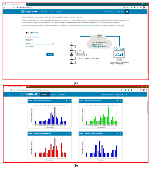 In this simulation test, the outcomes of smart EMS applied with the proposed method over a cloud-platform to control devices in the microgrid are introduced and discussed. In this paper the MATLAB is a chief command and control unit organizing a ThingSpeak platform, developed in a software communication and architecture interface. MQTT functions as a broker between subscribing microgrid devices and main control unit. In this paper, the ThingSpeak platform interface that has been designed is a simple and convenient Graphical User Interface (GUI) that allows a house owner to interact and access with their home energy management as a service over the cloud system. Figure 7a shows the ThingSpeak web page to the enter user name and password of the customer, Figure 7b,c shows the ThingSpeak dash-board illustrate the results of the proposed system