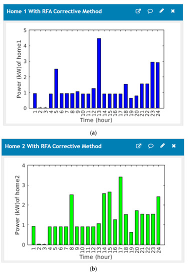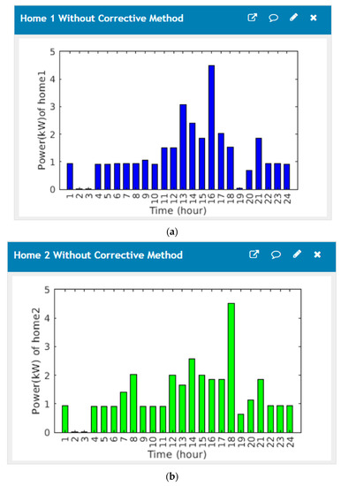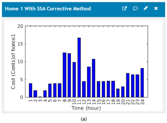 The home energy management system comprises a GUI and related software to facilitate users power consumption and total cost of the microgrid devices; their power consumption of all homes without the corrective method is implemented as displayed in Figure 8. Figure 9 shows the cost graphical user interface of proposed home energy management system without the corrective method, (a) cost profiles of the first house, (b) cost profiles of the second house, (c) cost profiles of the third house.