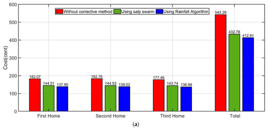 After applying the suggested scheme, it is notable that the micro grid energy cost has been reduced from 542.2977 cents (USD) to 432.7899 cents (25.3%) by using the salp swarm algorithm, as depicted in Figure 14b. Additionally, it is notable that the micro grid energy cost has been decreased from 542.2977 cents (USD) to 412.9103 cents (31.335%) by using the rainfall algorithm, as depicted in Figure 14c.
