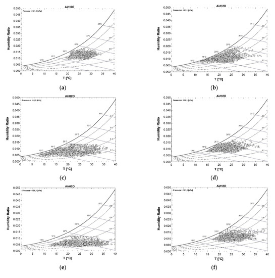 As can be seen in Figure 9, the evolution of the outdoor temperature during the period analysed showed differences at each site. The predominant difference was 8 °C between the coldest and the hottest climate. This difference was reduced to 4 °C in the second and fourth week of July and the third week of August. In the second week of August, this differential reached 10 °C. The disparity in weather conditions between the different climates resulted in different performances of the PDEC system. The average values of the outdoor conditions for each location in the analysed period are shown in Table 1. The psychometric diagrams are shown in Figure 10. Five climate types are established according to these parameters: