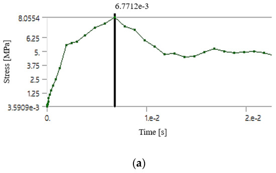 The behavior of concrete varies depending on the compression and tension. The principal stress is evaluated mainly during construction, and a notable characteristic of concrete is that its tensile strength is weaker than its compression strength. During our analysis, the effect of tension was examined based on the primary maximum principal stress. The maximum principal stress over time of the concrete used in the walls of the reactor cavity was 8.06 MPa in the Drucker-Prager model, as shown in Figure 7a, and 7.03 MPa in the Menetrey-Willam model, as shown in Figure 7b. Figure 8 shows the distribution of the principal stresses for each model. The maximum principal stress occurred at 6.77 × 10−3 s in the Drucker-Prager model and at 5.80 × 10−3 s in the Menetrey-Willam model. Figure 9 details the maximum principal stress distribution of the concrete in the damaged parts of the walls of the reactor cavity.