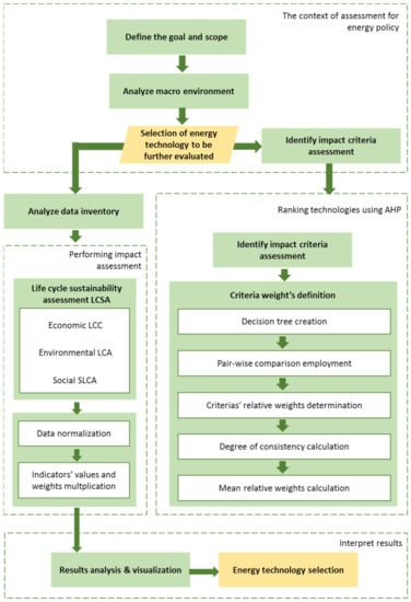 Therefore, this study fulfills an existing research gap concerning the lack of renewable sustainability assessment considering macroeconomic analysis in the current MCDM frameworks. The presented assessment approach is based on a combination of life cycle sustainability analysis (LCSA), AHP, PESTLE within the MCDM framework. In this paper, the PESTEL was used to reach a trade-off prior to the start of the ranking of technologies through the AHP to be assessed within LCSA. A way of sustainability assessment is LCSA used to evaluate impacts caused during the product life cycle. Because the LCSA deals with numerous criteria, measures, and indicators, they are grouped and contained within the three dimensions of sustainability (environmental, economic, social). Then, the sustainability criteria are directly connected to decision-making processes that find the trade-offs between them and support the selection of the most sustainable technologies []. The AHP was used to provide the interdependence of criteria and finding a solution to complex multicriteria problems [].
