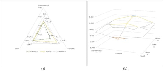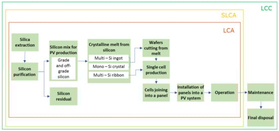 The proposed assessment is based on the real case from the industrial plant obtaining subsidies from Polish public institutions. In order to fulfill the requirements for governmental support, it needs to incorporate a goal of becoming an industrial plant shifted towards sustainability. To meet this objective, the company decided to implement an assessment method for choosing the most appropriate renewable technology for their facility. The initiative of the company was to check which type of selected renewable technologies is characterized by the highest level of compliance to the environmental, social, and economic issues. Due to the attempt of starting with the sustainability assessment, the company decided to use the data from the available scientific literature. This study was not based on individual data from specific manufacturers. The reason behind it is the fact that the performance of selected technologies produced by different organizations may vary and that would make the assessment not represented within the context of general technology evaluation. Therefore, the assessment was conducted upon relevant aggregated data (criteria weights and scores) that were available in various reports, research papers, and publicly accessible academic datasets [,]. Boundaries for the life cycle sustainability assessment concentrate on the crystalline silicon solar cells including crystalline polycrystalline (multi-Si), monocrystalline (mono-Si), and string ribbon (ribbon-Si) solar panels (see Figure 2).