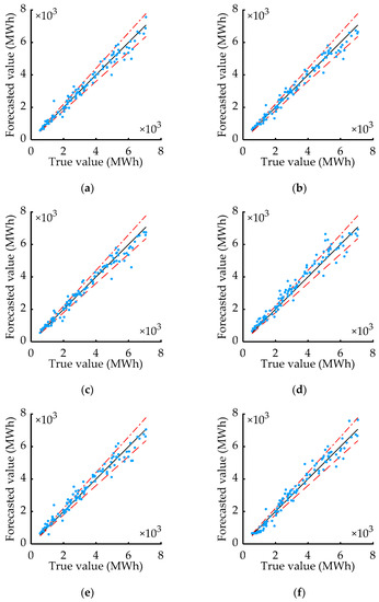 The comparison of the forecasted value and the true value of each model in HC city and GL city are shown in Figure 13 and Figure 14 (the three straight lines in each figure represent y = 1.1 x, y = x, and y = 0.9 x from top to bottom). In the results of HC city and GL city, almost all the points of the proposed model fall between the two lines and are closer to the diagonal line y = x, which indicates that the forecasted values of this model are closer to the true values and that the forecasting accuracy is higher than that of other models.