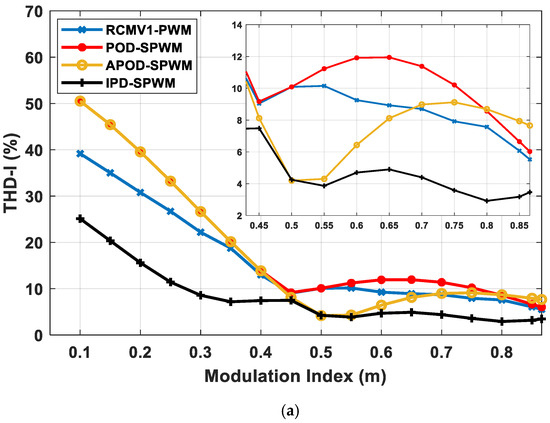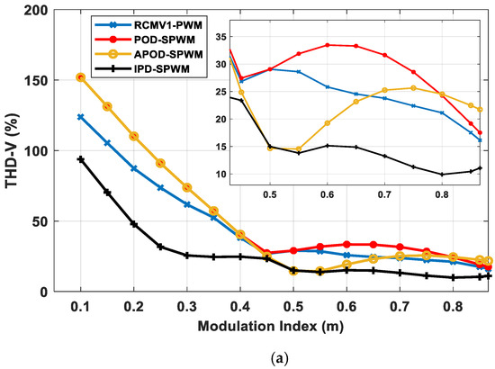 On the basis of the comparable power loss set forth in Section 4.2, the output harmonic distortion performance of RCMV1-PWM is compared against that of other methods. The THD and WTHD of voltage and the THD of current, as well as the RMS value of current ripple, are evaluated with regard to the modulation index for four strategies. Figure 5 and Figure 6 shows that the IPD-SPWM gives the best output quality for a whole modulation range due to the three nearest vectors principle. However, the magnitude of CMV is twice as high as that of other strategies, as illustrated in Figure 7a. Hence, it is unfavorable in motor-drive applications due to adverse effects of high CMV magnitude, as mentioned earlier. As demonstrated in Figure 5 and Figure 6, the proposed RCMV1-PWM produces better output harmonic performance than the POD-SPWM over a whole modulation range. For example, at m = 0.3, the THD values of voltage and current outputs are 61.78% and 22.19%, respectively, for RCMV1-PWM as opposed to 73.55% and 26.65%, respectively, for POD-SPWM. This translates to a more than 10% improvement of THD of voltage output and a more than 4% improvement of THD of current output. Likewise, at m = 0.3, the WTHD of voltage output, and the RMS value of phase current ripple, are 0.61% and 0.13 A, respectively, for RCMV1-PWM in comparison to 0.73% and 0.16 A, respectively, for POD-SPWM. Both RCMV1-PWM and POD-SPWM produce a reduced magnitude of CMV of for a whole modulation range, as shown in Figure 7a. As a result, under the reduced-CMV-magnitude condition, RCMV1-PWM is more favorable than POD-SPWM in motor-drive applications due to the lower output harmonic distortion. As for APOD-SPWM, its THD and WTHD of both voltage and current outputs, as well as RMS value of current ripple, are inferior to those of RCMV1-PWM for and . For these two modulation ranges, both APOD-SPWM and RCMV1-PWM obtain a reduced CMV magnitude of as demonstrated in Figure 7a. For , the output harmonic performance of APOD-SPWM is better than that of RCMV1-PWM. However, the CMV magnitude of APOD-SPWM in this modulation range is the same as that of IPD-SPWM, i.e., as shown in Figure 7a. Hence, the better output harmonic performance of APOD-SPWM is achieved at the expense of higher CMV magnitude. Therefore, under the reduced-CMV-magnitude condition, the proposed RCMV1-PWM gives the most optimum output harmonic performance.