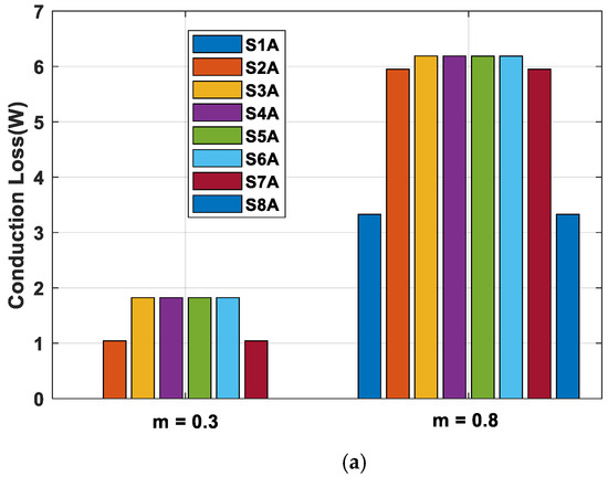 The conduction and switching loss of eight IGBTs of the phase leg A for RCMV1-PWM at m = 0.3 and m = 0.8 under the power factor of 0.99 in the five-level CHB inverter are shown in Figure 8. As shown in Figure 8, the equal power loss distribution among switching devices is achieved for the proposed strategy, as indicated in Section 2.