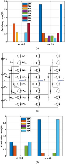 By contrast, the NPC converter, which has the issue of unequal power loss distribution [11] illustrated in Figure 9 for a five-level NPC inverter, possibly leads to failures in some switching devices that have to experience a considerable amount of power loss over a long-term operation, thereby reducing the efficiency and reliability of a system, as well as the overall switch utilization [11]. The active neutral point clamped (ANPC) converter was proposed in [11] to resolve this issue. However, the increase in the number of switching devices results in higher power loss, and the control strategy is more complicated when compared to the CHB converter at the same number of levels. Therefore, the CHB converter topology with the proposed strategy featuring lower CMV magnitude, zero average CMV, and improved output harmonic distortion, as well as equal power loss distribution among switching devices, becomes a topology of choice due to higher efficiency and reliability over a long-term operation as opposed to the NPC one for the number of levels being greater than or equal to 5 (n 5).