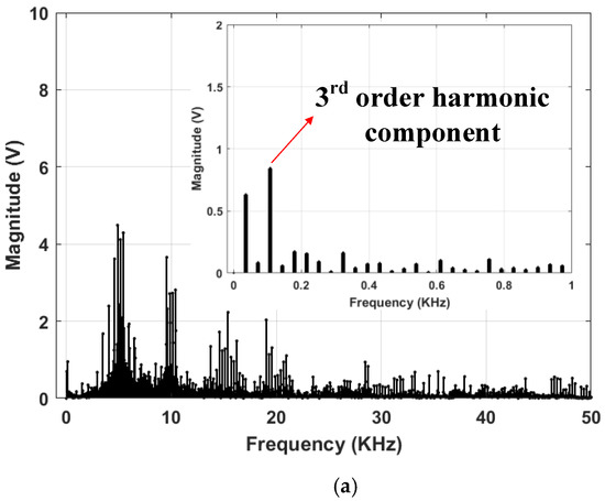 As for the CMV reduction performance, both RCMV1-PWM and POD-SPWM produce a reduced magnitude of CMV of for a whole fundamental frequency range. In particular, the CMV waveforms and their frequency spectra are shown in Figure 11a,b and Figure 15a,b, respectively, at f0 = 36 Hz (m = 0.623). The CMV reduction performance is demonstrated by the reduction in the magnitude of CMV components around the switching frequency (f = 5 KHz). Specifically, they are less than 5 V for both RCMV1-PWM and POD-SPWM compared to more than 10 V for APOD-SPWM at f0 = 36 Hz (m = 0.623), as shown in Figure 15. Moreover, the 3rd harmonic component of CMV, as shown in Figure 15, is well less than 1 V, which accounts for less than 2% of Vdc (Vdc = 50 V), thereby ensuring the zero average CMV in one sampling period for RCMV1-PWM. Therefore, under the condition of the reduced magnitude of CMV, the zero average CMV, and the equal distribution of power loss, the proposed strategy produces the most optimum output harmonic performance when compared to POD-SPWM, and APOD-SPWM.