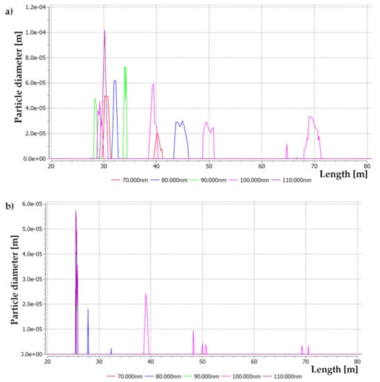 If the results of the changes in the concentration of ultrafine aerosols in the graph in Figure 17 are compared with the results of numerical calculations presented in Figure 12c,d, the trend in the increase in aerosol concentration measured at a height of 1.55 m on the floor of the excavation can be observed. On a section of 28 m (5 m from the nozzle) from the inlet to the model excavation, numerical simulations showed an increase in the size of coarse aerosol particles in the excavation, similarly to real measurements. Moreover, along the length of the excavation approximately 50 m (25 m from the nozzle), numerical simulations have shown the maximum aerosol particle size values. Additionally, in this length of the excavation section, numerical calculations showed the inlet of the aerosol particle size drop until complete evaporation, which was observed at a distance of 60 m (45 m from the nozzle) from the excavation inlet.